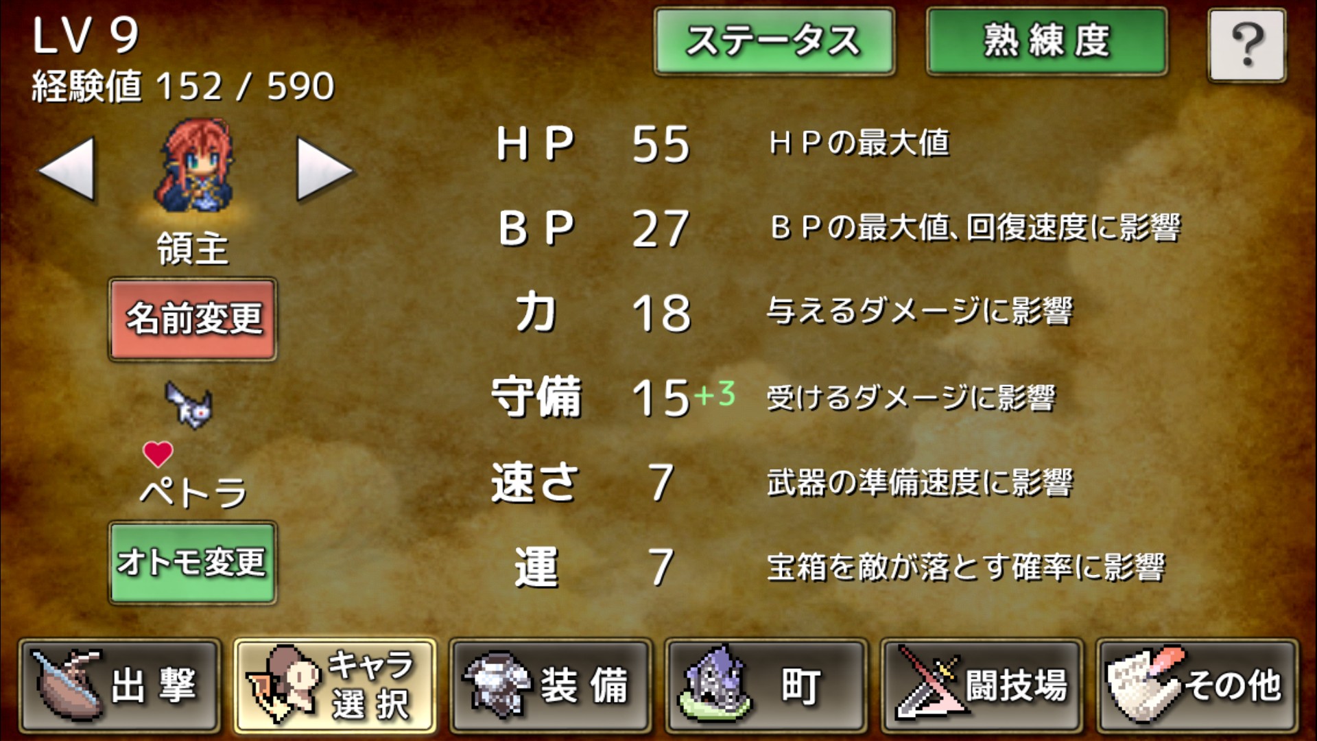 マップをクリアしてストーリーを進めると、仲間として、巫女、狩人、剣士などが加わっていきます。彼らにはそれぞれ能力値が設定されていて、バトルで勝利するごとにたまる熟練度(JP)によって、ステータスアップなどの効果を発動することができます。自分のプレイスタイルに応じて、特定のキャラクターに特化してプレイするのも、まんべんなく力を着けていくのも、プレイヤーの選択次第です。