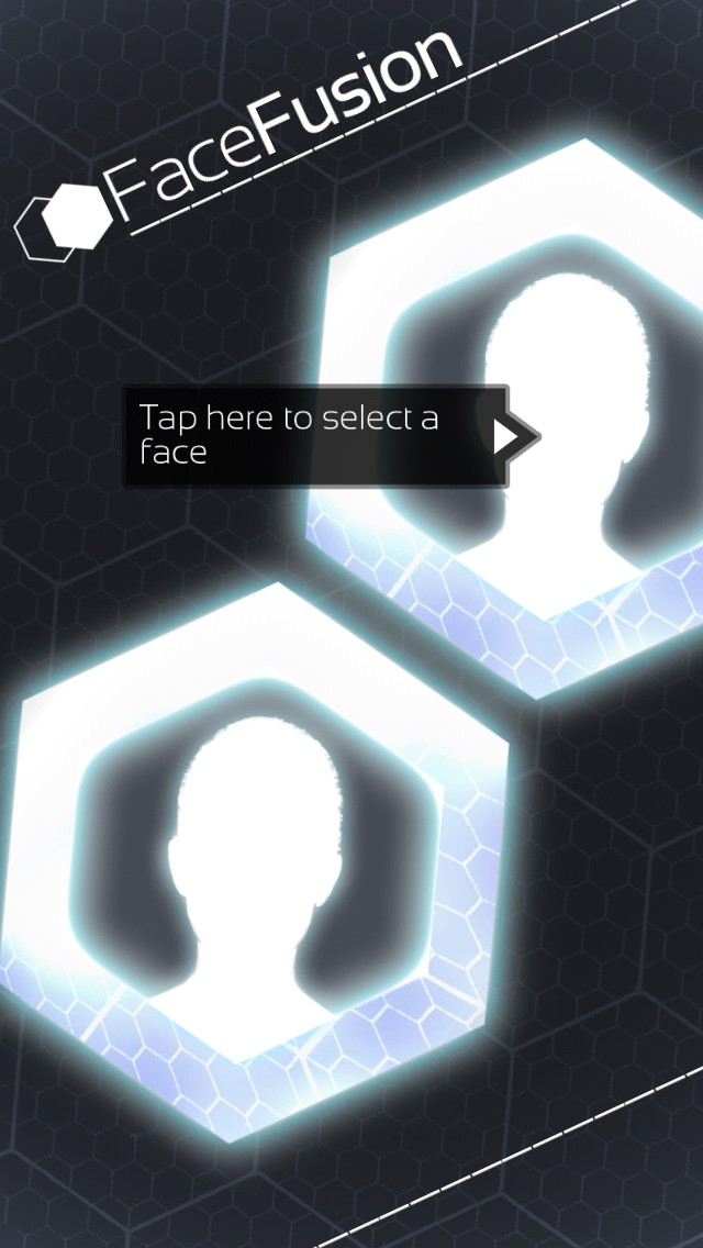アプリを起動すると、画面上に六角形の画像が2枚表示されます。「Tap here to select a Face」をタップし、「+」ボタンをタップしましょう。画面下部のボタンから写真を撮影するか、スマホのアルバムから化お写真を選択します。選択すると自動的に目、輪郭、鼻と口の位置を検出しますよ。目などの位置が間違っているときなどは、画面上で微調整できます。同様の操作で、ミックスしたい写真を追加しましょう。