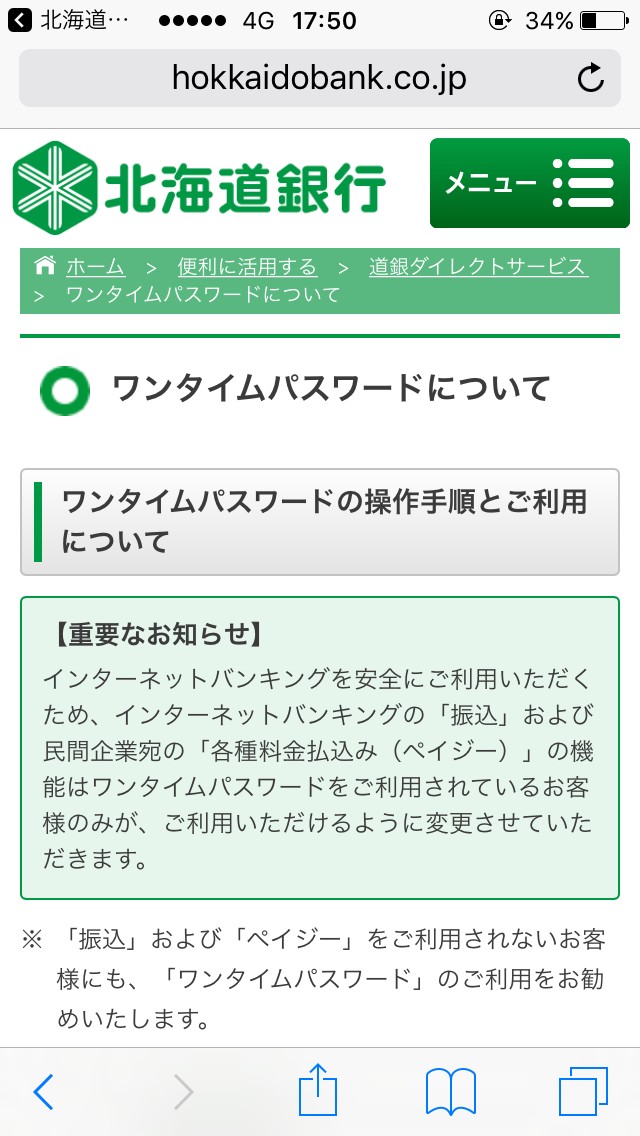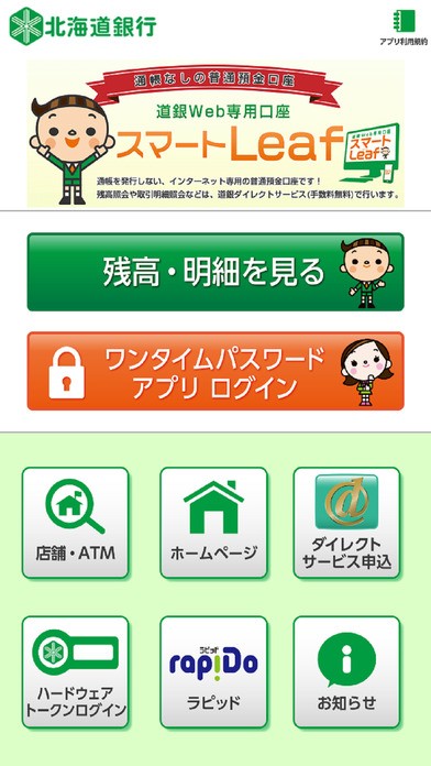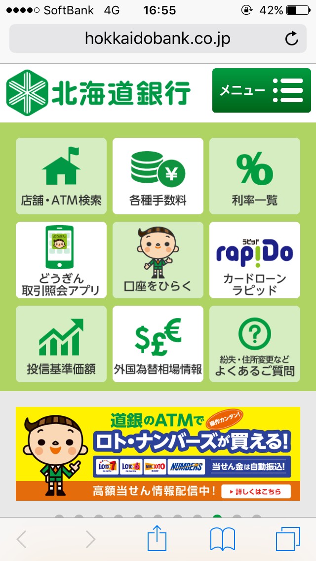 指先1つで確認が出来ます。北海道銀行の可愛いキャラクターが出迎えてくれます。その他にも北海道銀行のホームページのリンクにも