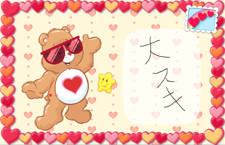 パステルカラーのかわいいケアベアは見ているだけで幸せな気持ちになってくる癒しキャラです。オリジナルが作れるし、色やマークにもいろいろ意味があるので、どんなケアベアにしようかと考えながら作るのは、単に色を塗ったりスタンプを押すのとは違った楽しみもあります。大切な人へ想いのこもったケアベアでメッセージを送ると、きっと喜ばれますよ!ケアベアが英語でしゃべってくれるから、英会話に興味のあるお子様にもおすすめです。