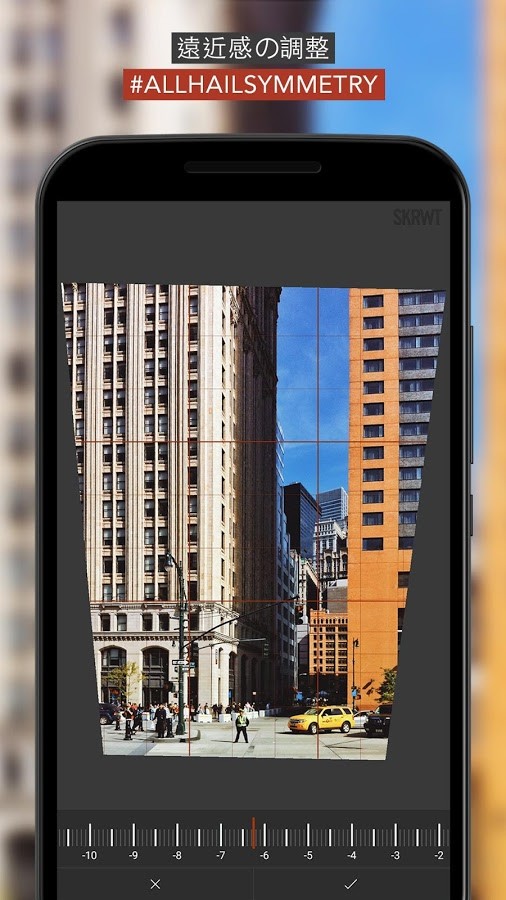 写真の傾きや歪み気になりませんか?「SKRWT」は写真の傾きを自在に調整して、いい感じに直せるアプリです。例えば、旅行に行ってスカイツリーの写真を下から撮ってみて「もうちょっとスカイツリーの全体像を綺麗に写せたらなぁ」と思った時、このアプリの出番です!なんと、正面から撮っているように修正をかけることができる驚きのアプリなのです。
