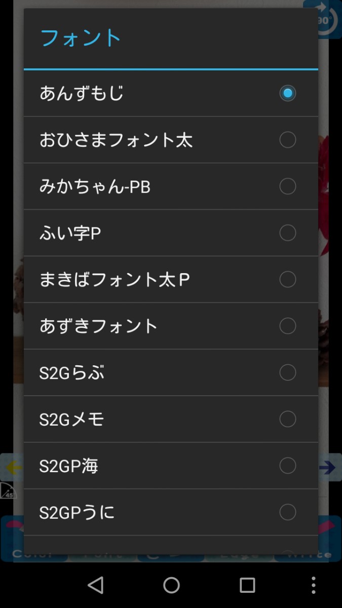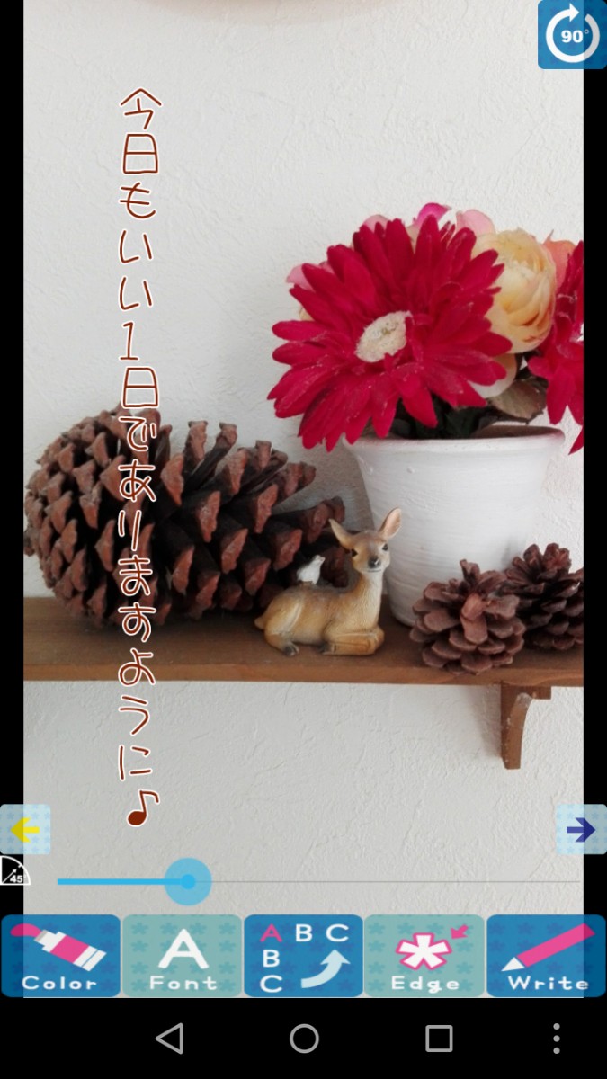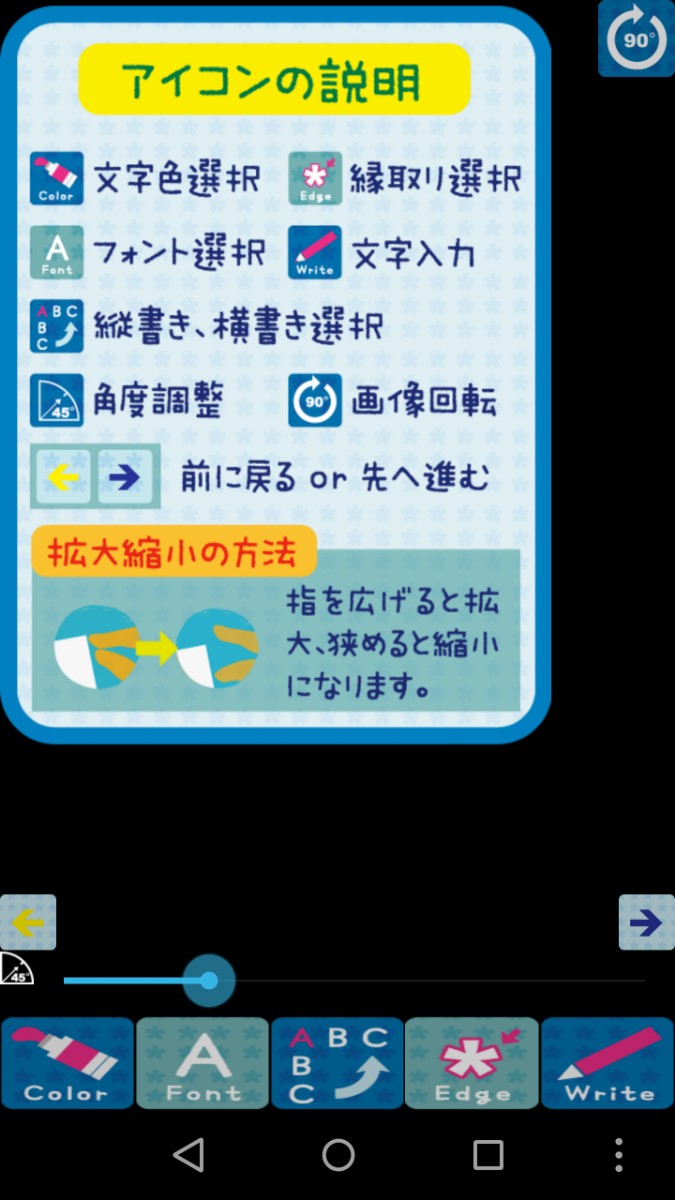 このアプリは写真に文字を入れるというシンプルなアプリで、スタンプやフレームなどはありませんが、そのぶん文字入れに関して細かい調整ができることが特徴です。縦書き、横書き、斜めにしたり回転させたり、大きさも自由自在。ふちどりもできるし、文字の透明度や色味もかなり自由に調整できます。