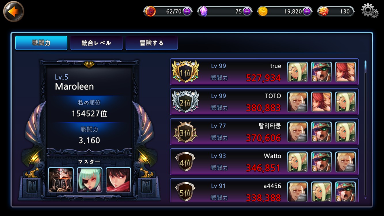 キャラクターがレベルアップしたら、ランキングをのぞいてみましょう。