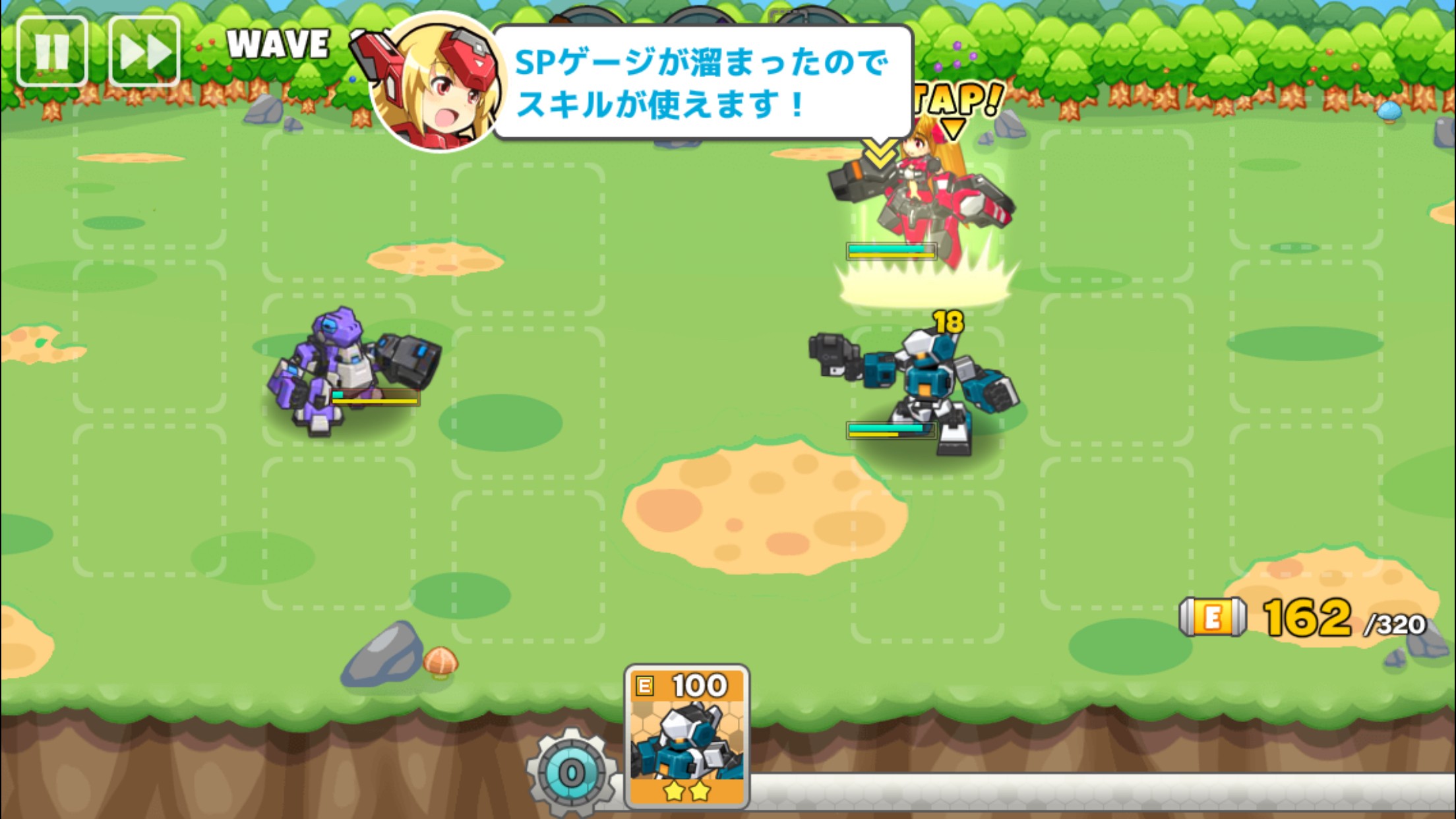配置したロイドの「SPケージ」が溜まると「スキル」を使うことができます。「SPケージ」が溜まるとロイドの足元が光り、足元が光っているロイドをタップすると「スキル」を選択できます。