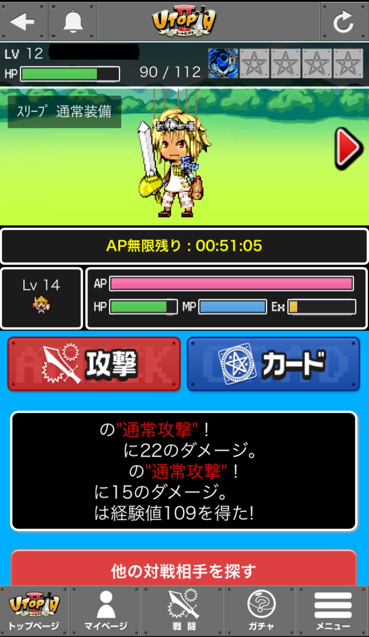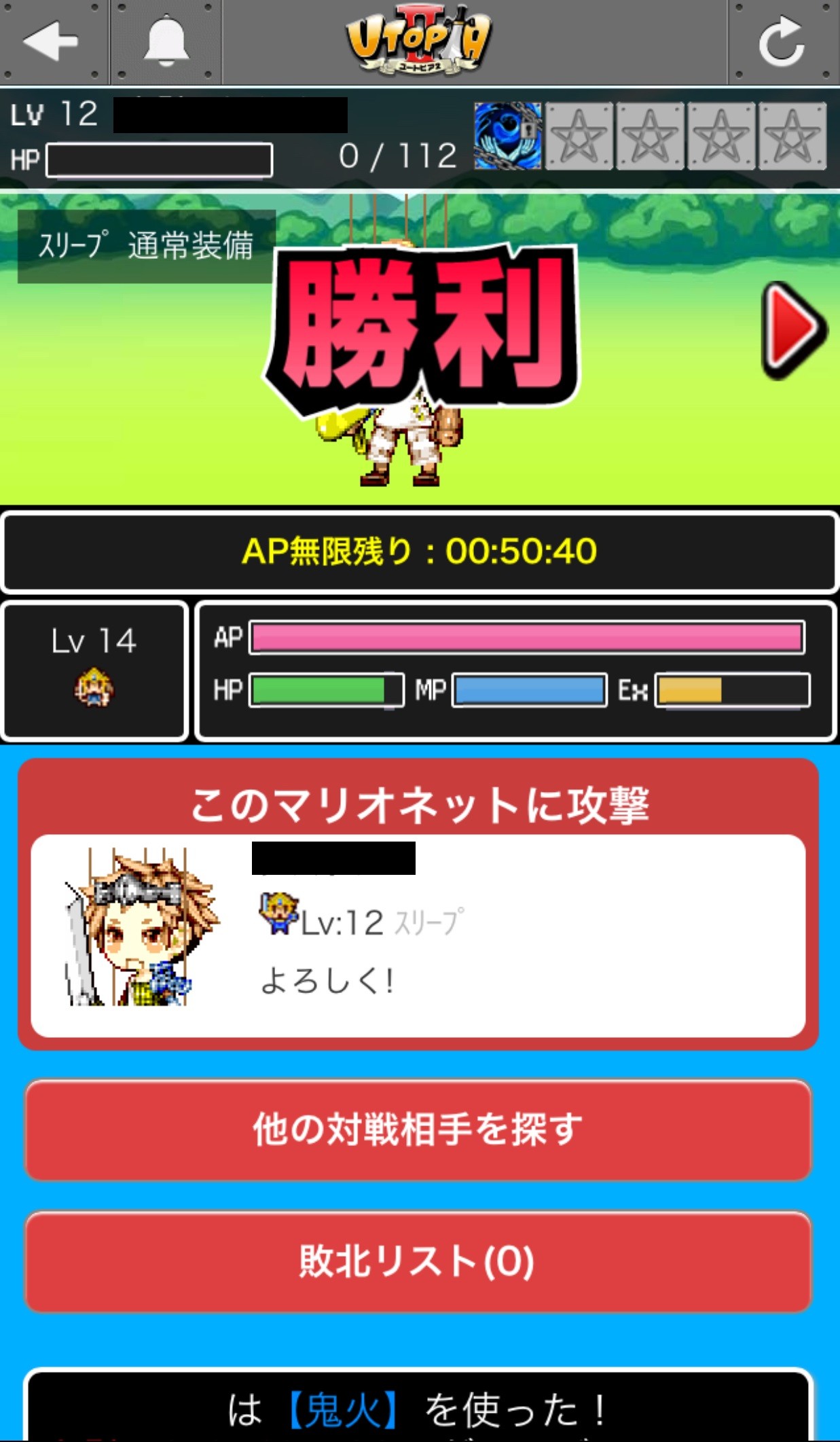 相手の「HP」を減らすためには攻撃をします。「攻撃」と書かれた赤いボタンを数回タップすると、あっという間に勝利することができます。