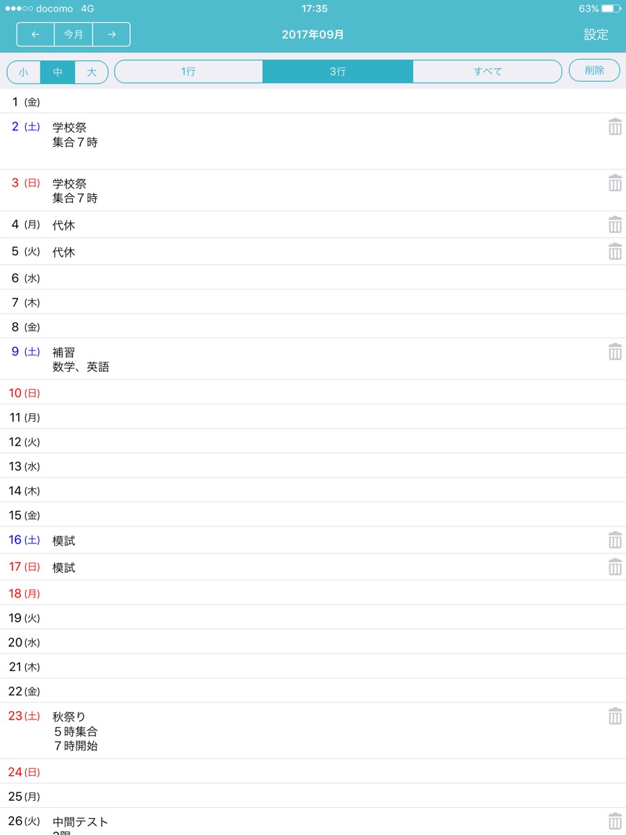 超シンプルな「縦型カレンダー」は、使いやすい操作性を重視し、誰でも操作に困ることがないように作られています。画面自体も特別なコマンド等が必要なく、シンプルに月単位や週単位での表示のみに特化しています。フォントカラーも、カレンダーで定番の黒青赤の3種類で日付が記されています。そのため日常のカレンダーと違和感なくスマホでも扱うことができます。文字のサイズを3段階切り替えることができ、状況や特記したい月や週に予定を強調することも可能です。ちょっとした予定のグループ分けをすることもできてしまいます。表示方法も1行表示と3行に切り替えることもできます。情報だけではなく、ちょっとしたコメントなどを書き足すと言うことにも使えます。