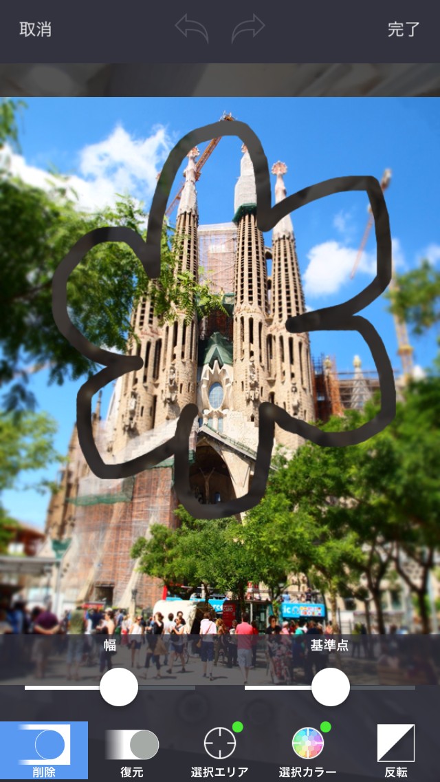 編集したいレイヤー画像をタップし、画面下部のボタンの左から3番目のボタンをタップします。画像を指でなぞると透明化されますよ。設定が完了したら、画面右上の「完了」をタップします。