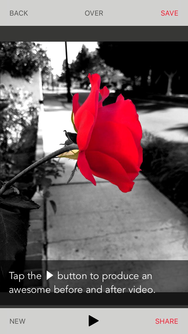 画面右上の「PROCESS」をタップします。表示された画面下部中央の三角ボタンをタップします。元の写真がどのようなプロセスで編集されたか動画を見られますよ。動画は、Instagramに投稿したり、スマホのアルバムに保存したりできます。