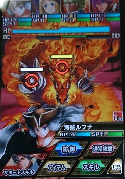 「通常攻撃」、「スキル」、「防御」、「アイテム」、「サポートスキル」を使いボスを倒していきます。