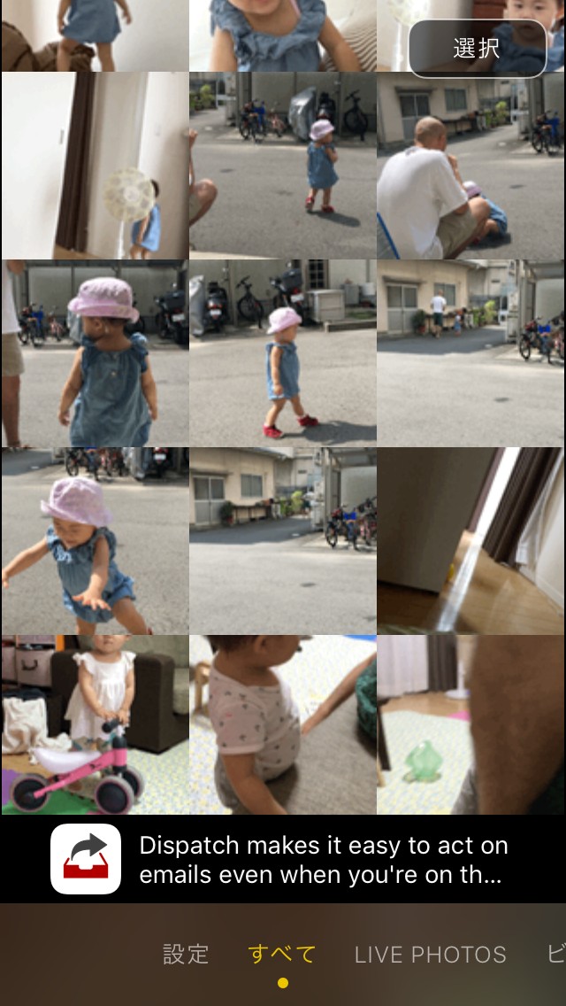 早速「Alive」を実際に使ってみました。まずアプリを開くと、複数のLive Photoと動画が二倍くらいの速さでアニメーション化されています。新しい順にそれぞれの動画が動いて表示されて、スクロールすれば過去の動画を振り返ることができるので、見ているだけで楽しいです。スワイプすると「設定」・「すべて」・「LIVE PHOTOS」・「ビデオ」の画面へ移動できます。右上の「選択」をタップしてから動画を複数選ぶと、一度に9枚まで一つのGIFに変換できますよ。「LIVE PHOTOS」と「ビデオ」を組み合わせてGIFにまとめることも可能です。選んだ動画は、「写真のみ」・「ビデオのみ」・「LIVE PHOTOS」・「GIF」「3GIF」に編集できます。右上のはさみマークでファイルサイズが変更できて、切り取りたい部分を選んで保存するだけの簡単な作業です。