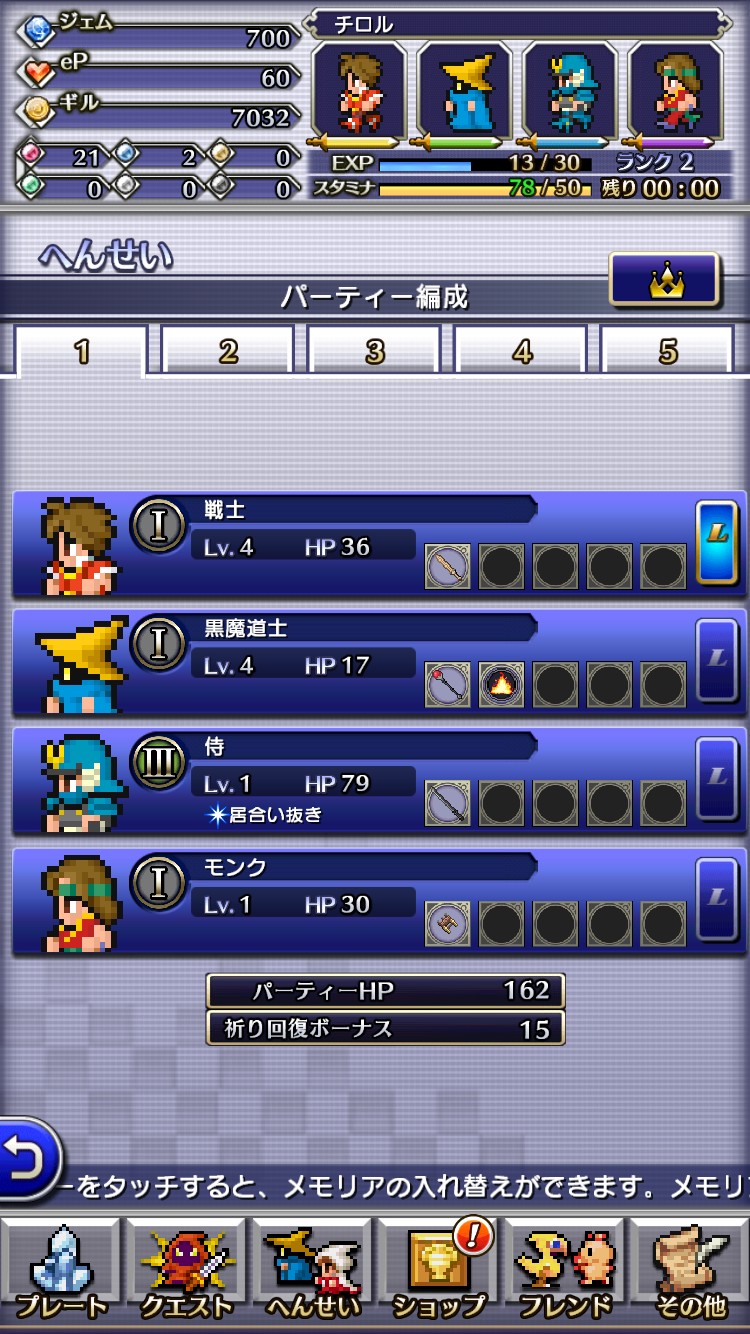 このゲームは、キャラクターのことをメモリアと呼びます。メモリアを手に入れるには、プレート鉱床と呼ばれるエリアのクリスタルプレートを探索しなければいけません。アプリメニュー下部のプレートを選択。モーグリに頼んで探索、自分で探索、モーグリの大好物で探索と様々な探索方法があります。それぞれ、ジェムと呼ばれる硬貨のようなものや、アイテムが必要になってきます。クエストをクリアしたり、毎日のログインボーナスによって得られるので、こつこつ貯めていきましょう。