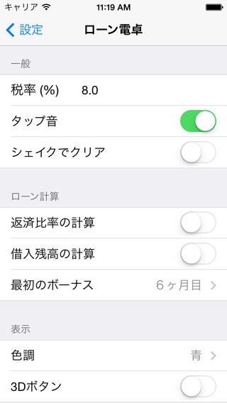 設定画面も、非常に見やすく、税率(%)の設定やタップ音のON/OFFなどはもちろん、シェイクでデータをリセットしたり、色調(テーマカラー)や3Dボタンで表示するかどうかの設定ができたり自由自在にできます。