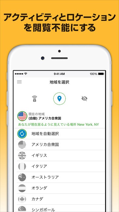 「地域を選択」VPNをオンにしていると、自分がいるように見せる地域を選択できます。例えば、日本にいてもアメリカに居るように設定しておくことができます。