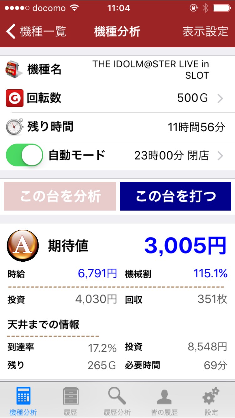 あっという間に解析してくれます。期待値(いくら稼げそうか)が表示されるので、台選びの参考にできそうですね!