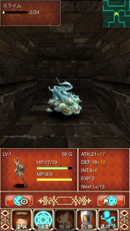 RPG迷宮の覇者ではダンジョンを進んで行く本格的なRPGの要素が搭載されているので、移動時もプレイヤー目線で移動します。移動方法は移動したい方向の上の壁をタップします。ダンジョンのマップが右上に表示されているのでどこに進めな良いか分からない時は参考にしましょう。道を進んでいると敵が現れるので攻撃をして敵を倒します。攻撃方法は敵をタップすれば攻撃ができます。敵を倒すと経験値なGを獲得することができます。更に行進するなら画面の下をタップし、左右視点を変えたい時は向きたい方向にスライドさせれば向きを変えることができます。