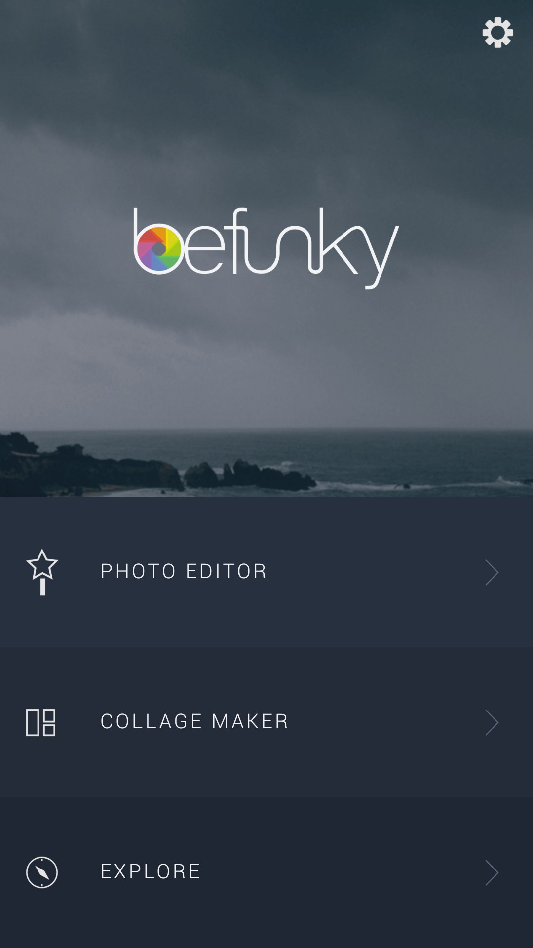 「BeFunky フォトエディタ・コラージュメーカー」を実際に使ってみました。まず、アプリを起動すると画像加工は、「PHOTOEDITOR」、「COLLAGEMAKER」から選択できるようになっています。「PHOTOEDITOR」を選択すると、
