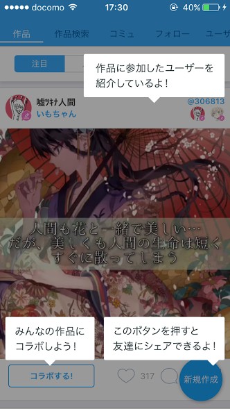 その後、投稿すると新着に表示されます。また、人気作品とのコラボもできるので、コラボを選択することで、素材を借りることもできます。