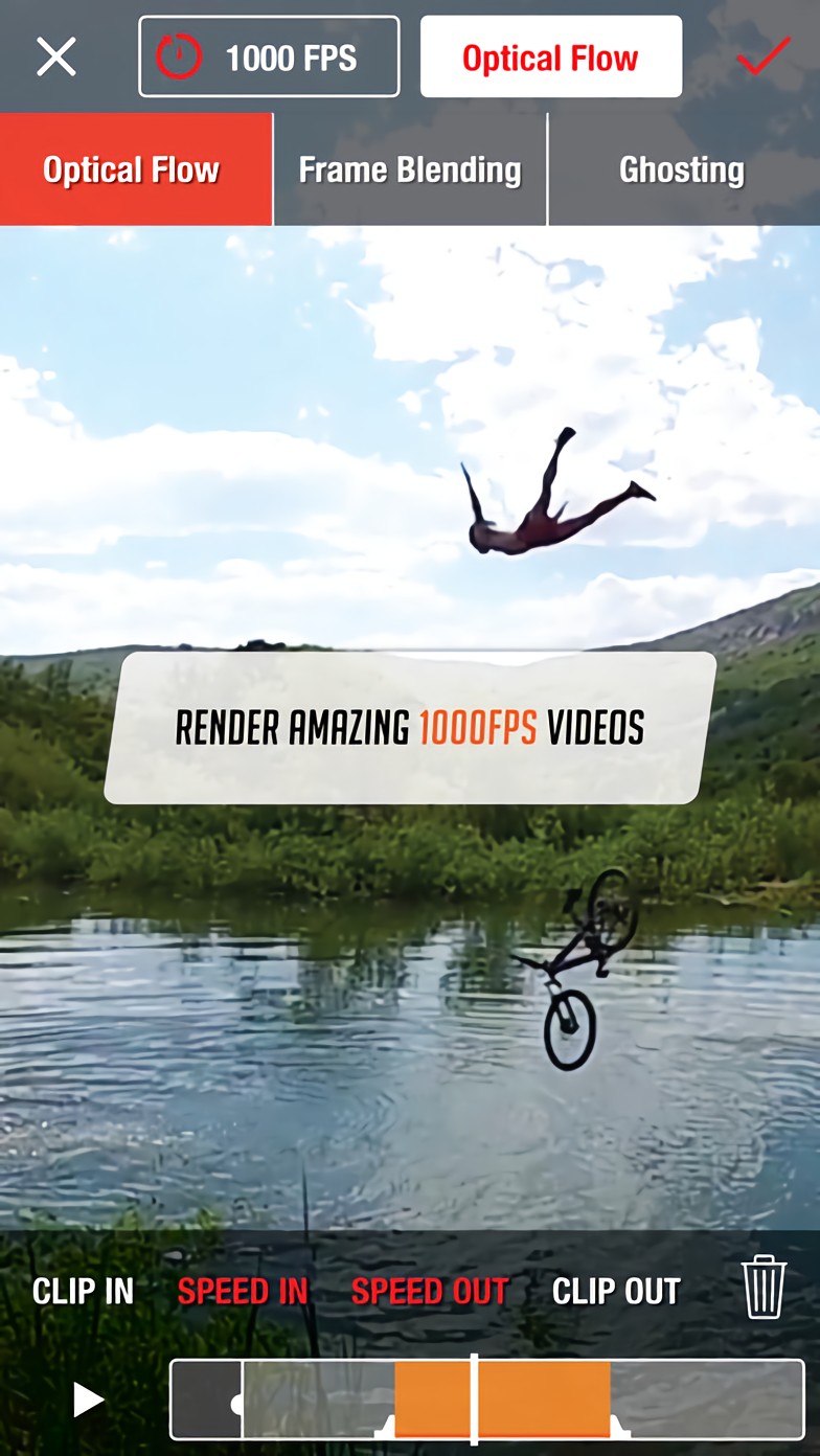 もうひとつの、フレームとフレームの間の補完は映像加工技術としては難易度の高いものですが、「SloPro - 1000fps Slow Motion Video」なら難しい操作は必要ありません。「Render」を選択して「Optical Flow」「Frame Blending」「Ghosting」の3つのレンダリング方法から好みのものを選ぶだけ。動きが滑らかになるだけでなく、残像が重なりながらゆっくりと動いたりするなど、それぞれ特徴的な加工を実現してくれます。いろいろと試しながらシーンや動きに合わせて好みのものを見つけましょう(Render機能はiphone版のみ)。