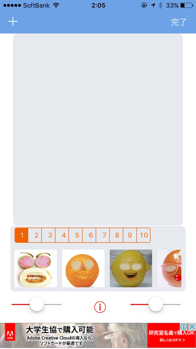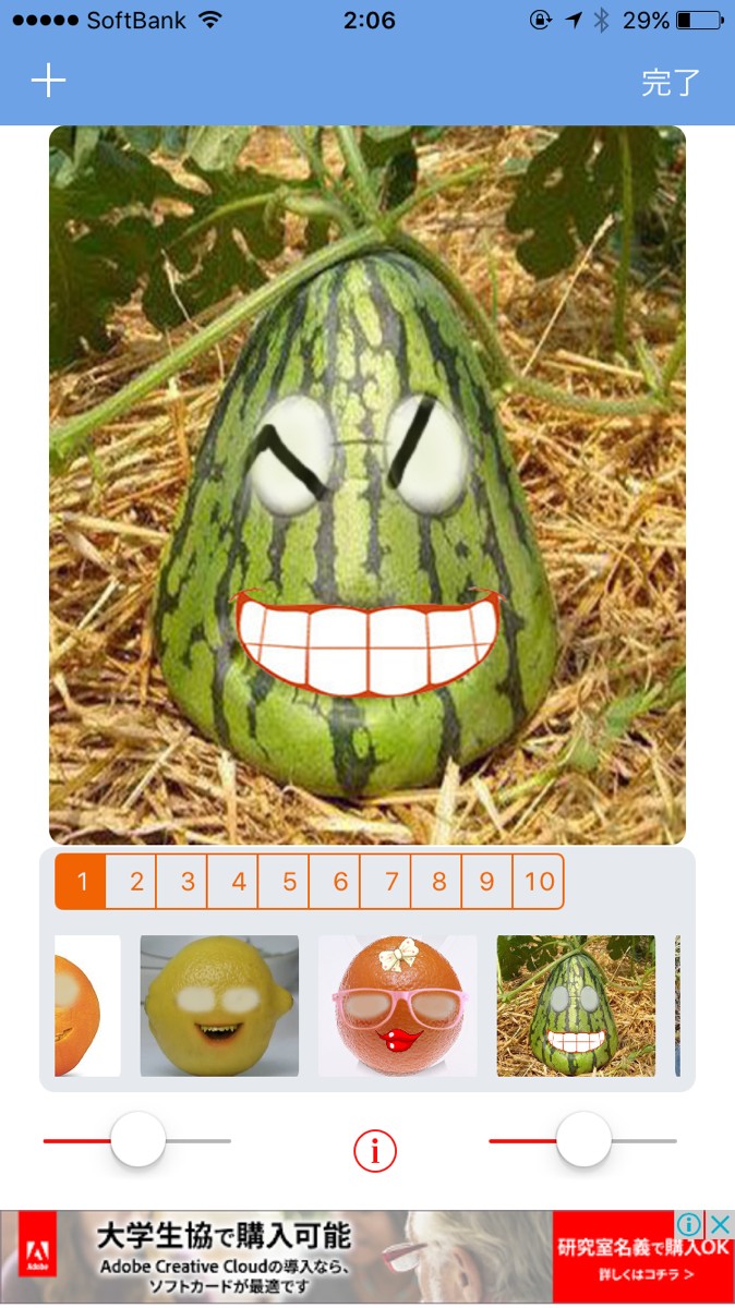 以上が「面白い食品顔移植カメラ」のおすすめポイントです。スイカや大根など、思いつかないような合成フレームばかりなので、どんなフレームがあるのか見ているだけでも楽しいですよね。SNSにあげる写真のネタを探している人にピッタリのアプリです。また、野菜とフルーツだけでも多くの種類があるのでつい見落としそうになりますが、フレームの上に並んでいる小さな数字を1つずつタップすると、また違うカテゴリーが表示されるので驚きです。数え切れないほど種類豊富なフレームが並んでいます。左上の「+」をタップして画像を追加して楽しむのですが、画像に合わせてフレームの色も変えられるんです。無料とは思えないほど充実したメニューがうれしいですよね。