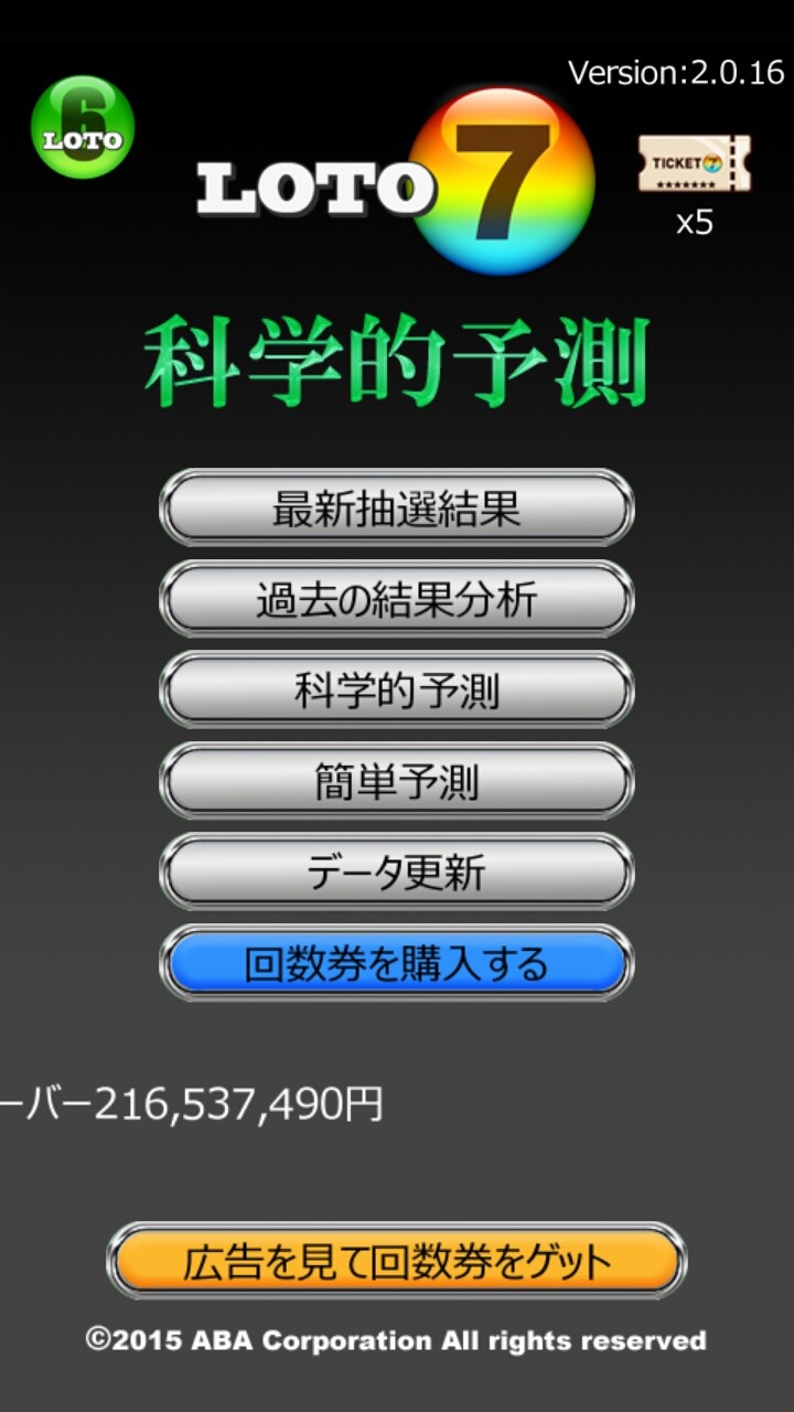 こちらが「ロト 7 科学的予測 - LOTO 7」アプリのメニュー画面です。