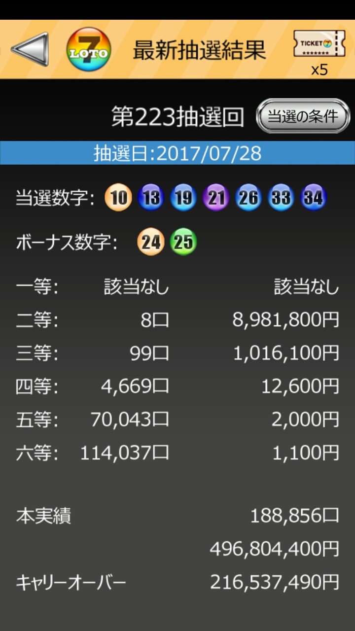 最新抽選結果確認はチケットを消費せずに確認できます。