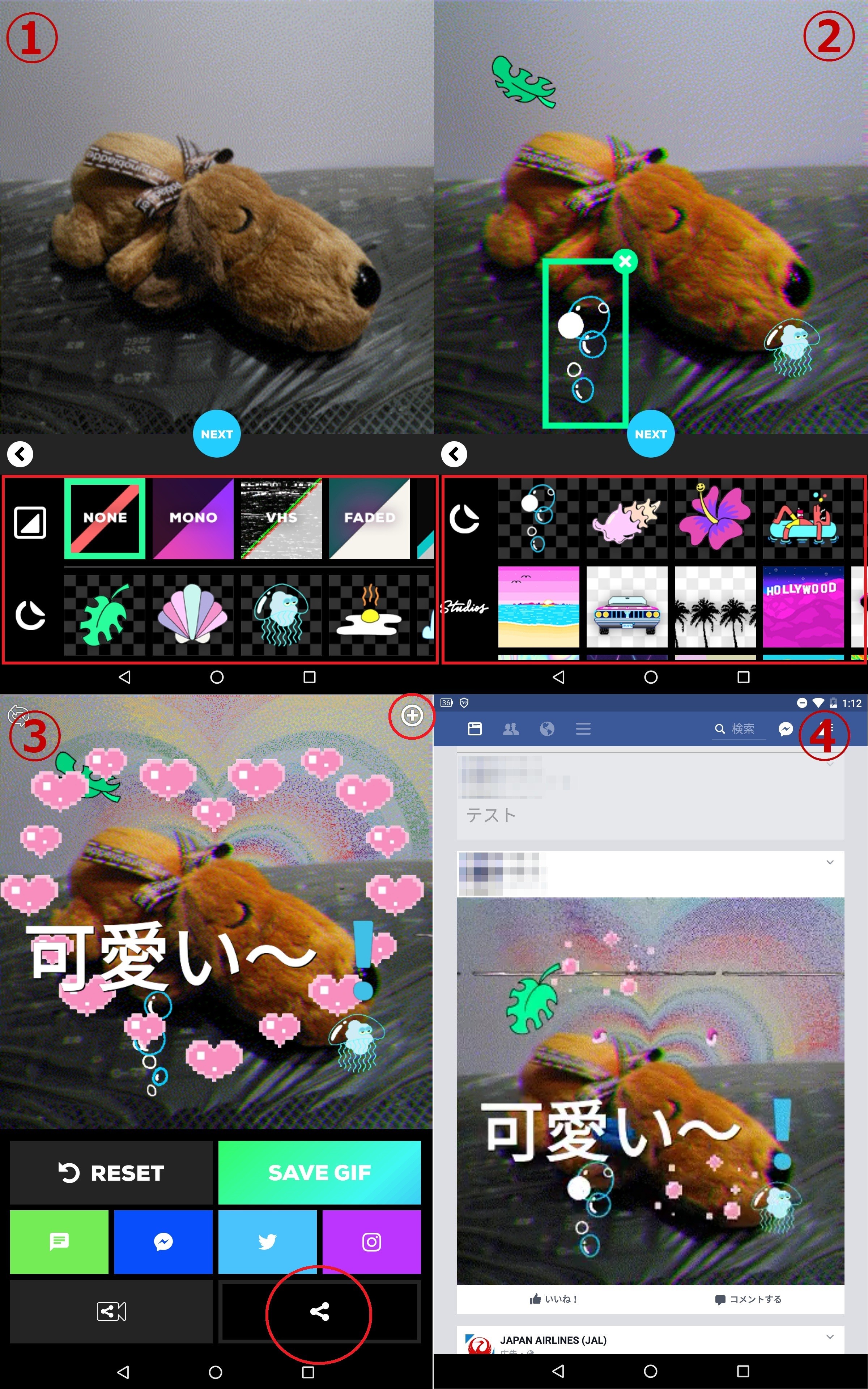 GIF動画を撮る ⇒ 撮影した画面にフィルターやエフェクト、好みのステッカーを付ける ⇒ 保存する ⇒ 投稿する