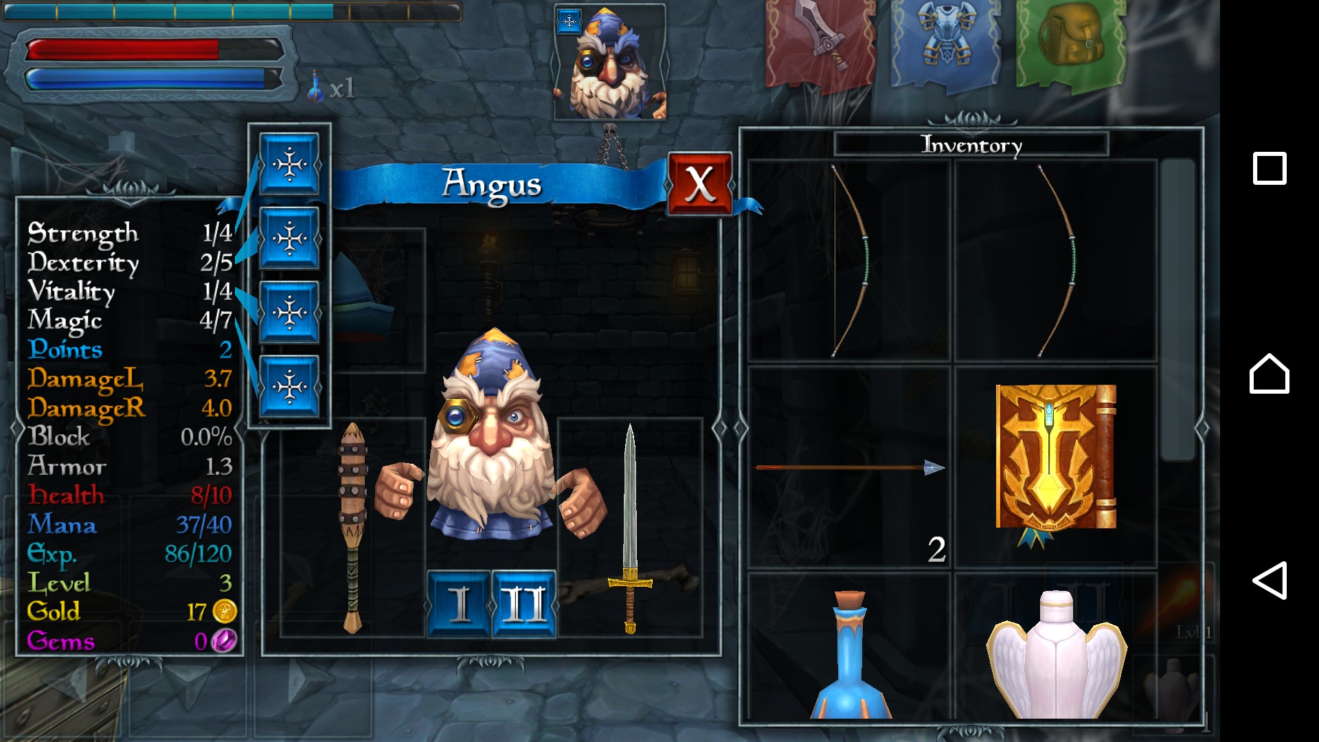 持ち帰った装備は、ダンジョンで手に入る金貨と、ダンジョンクリアで手に入るジェムを消費して、ショップで強化することができます。ジェムは他の英雄を解放したり、ダンジョンに連れて行くことでさまざまにプレイヤーをサポートしてくれるペットを解放したりするのにも必要なので、希少なジェムの使い所が難しいところです。最初からプレイできる20×20のダンジョンでは、敵の攻撃力もまだ低いので、ジェムを温存しておくのもひとつの手でしょう。