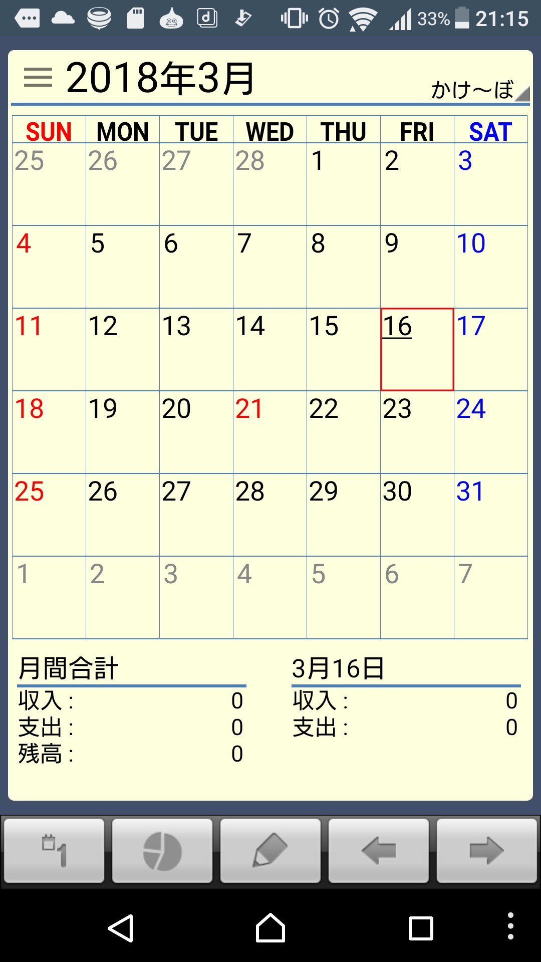 カレンダーには支出だけでなく収入も表示されます。