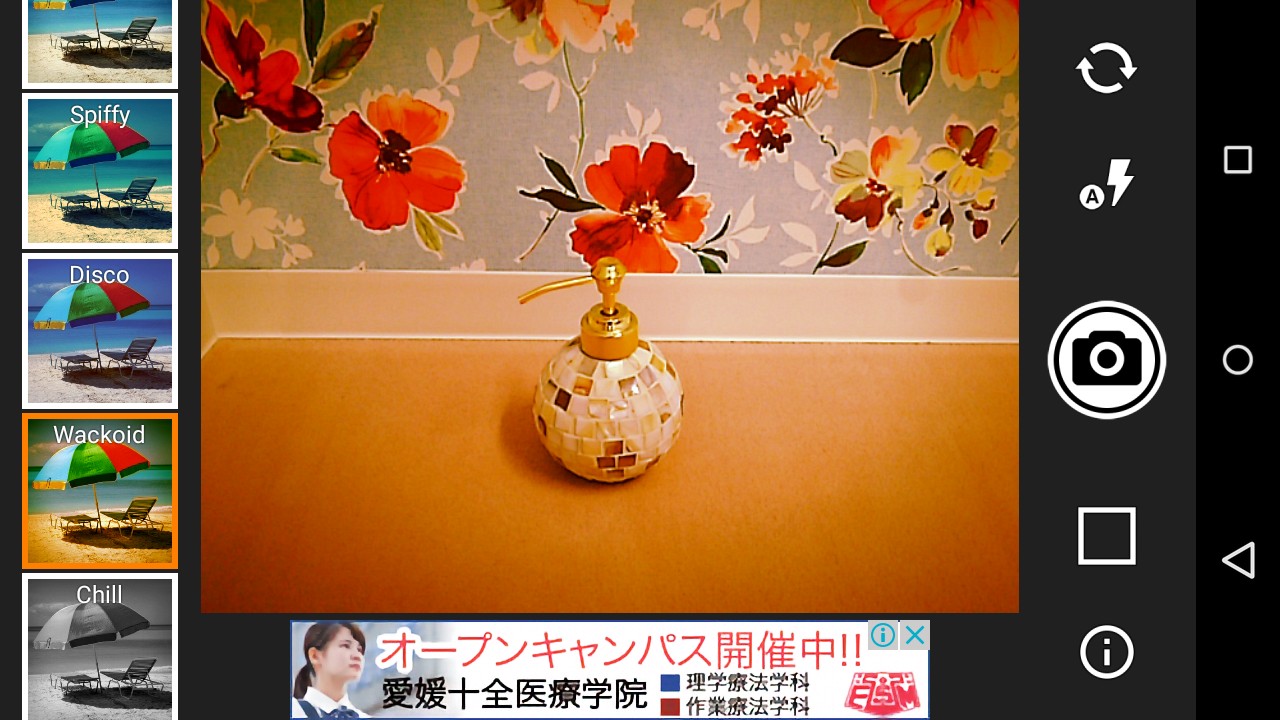 1.「Vintage Camera」を起動し、被写体にカメラを向けて撮影の準備をします。フラッシュボタンでオート、強制発光、フラッシュ禁止に変更したり、丸い矢印ボタンで自撮りモードにしたりできます。