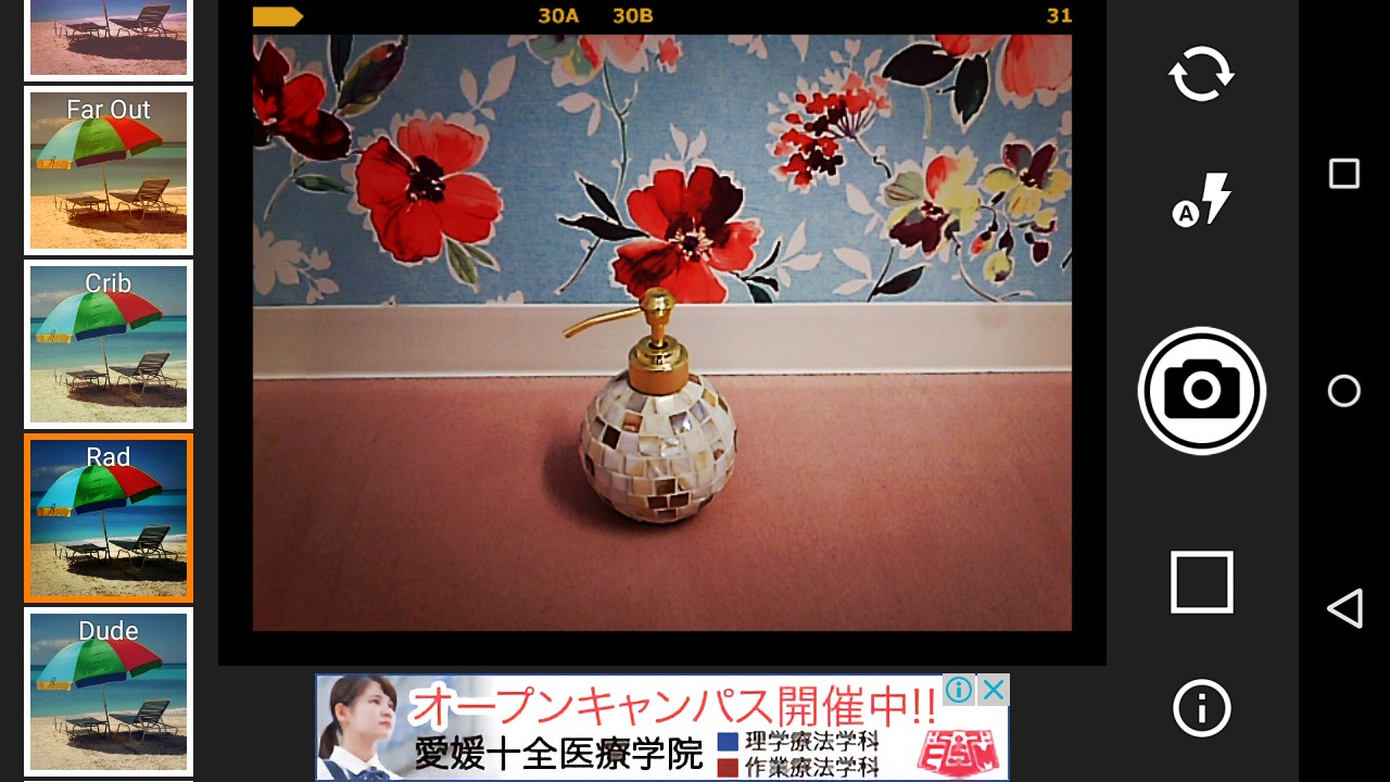 「Vintage Camera」なら、画面の被写体画像のすぐ横にエフェクトが表示されているので、スクロールして選ぶだけで、いろいろなエフェクトの写真を確認してから撮ることができます。