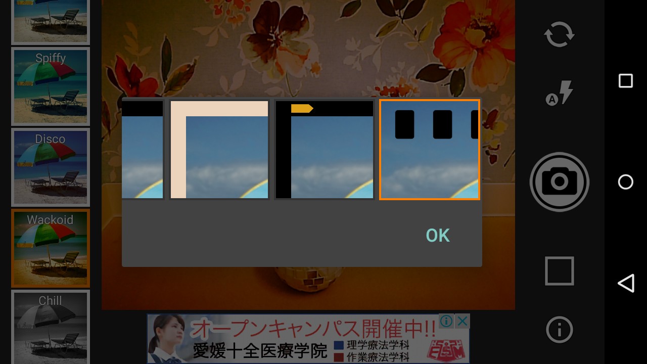 3.カメラボタンの隣の四角をタップしてフレームを選び、「OK」で確定します。