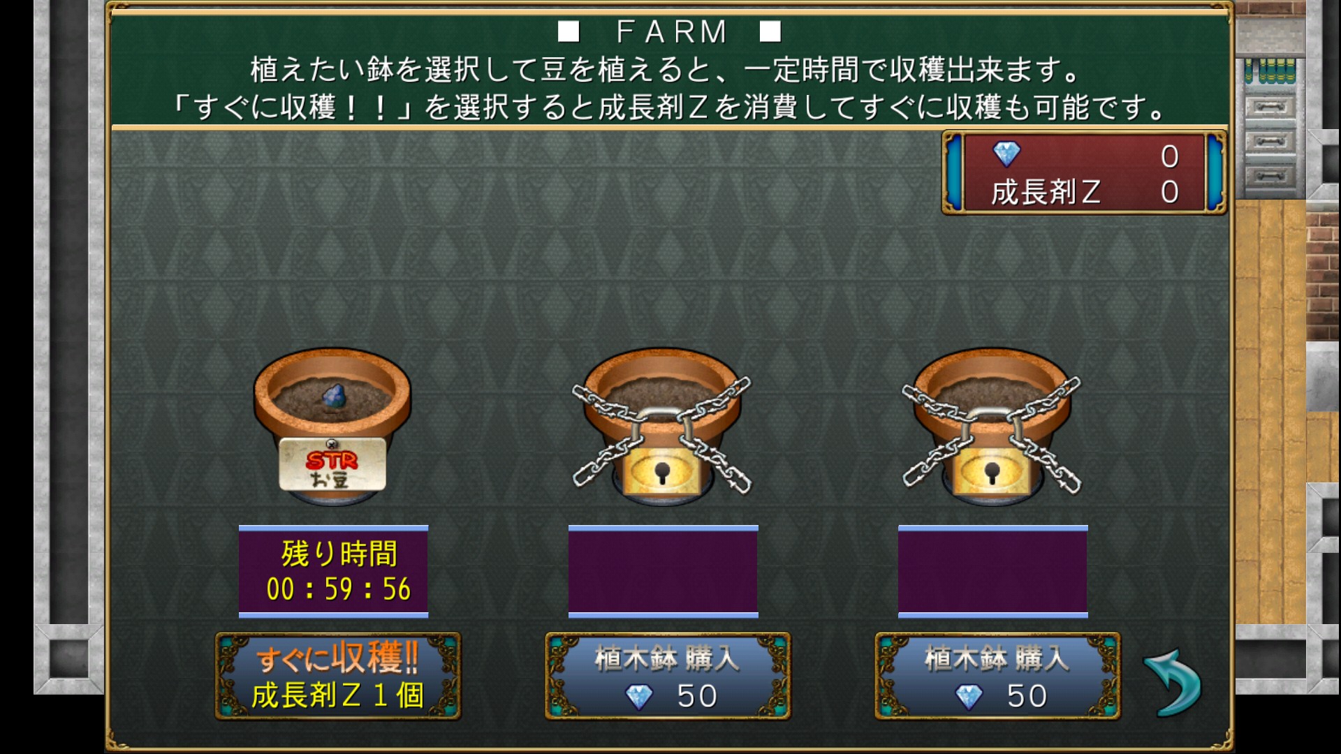 時間経過で実るのでどんどん植えて収穫して、キャラクターたちを強く育てていきましょう。