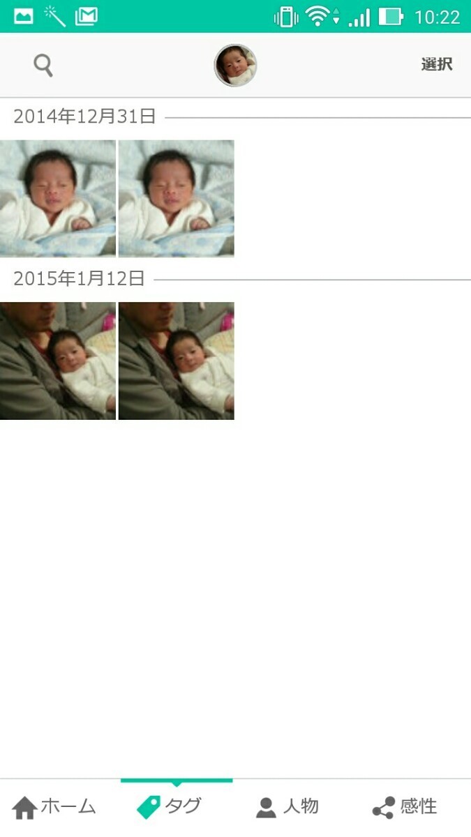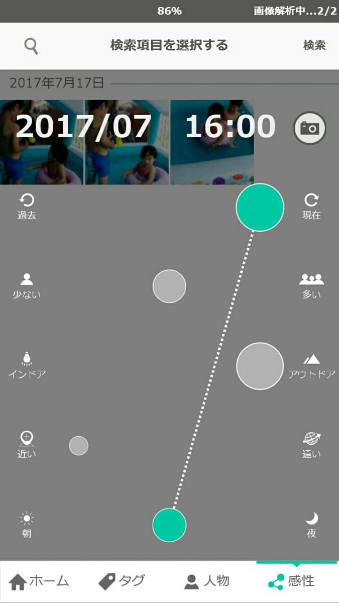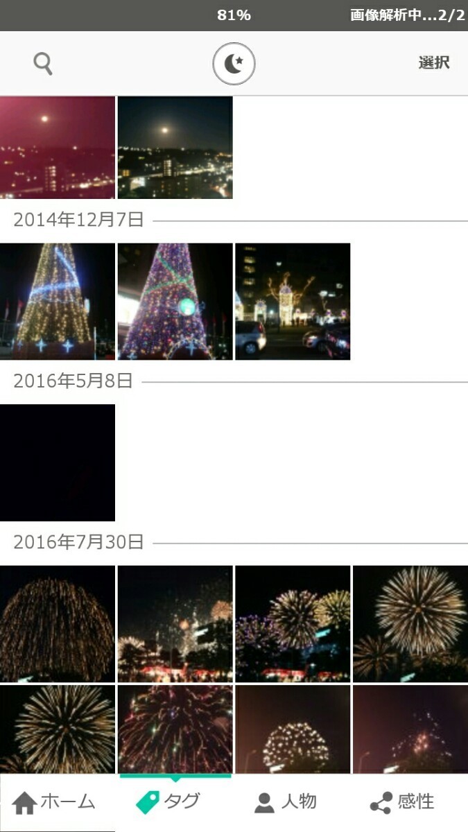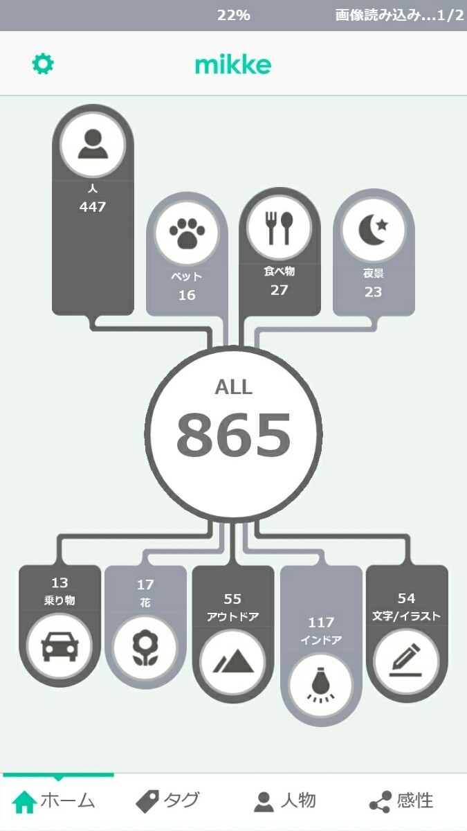 「写真をmikke(ミッケ)」を実際に試してみました。アプリを開き、「画像の解析をはじめる」をクリックします。画像解析の時間は、保存している写真データにより違いますが、約10分で終了です。解析が終了すると、端末に保存している写真の総本数と、9種類のタグそれぞれに、どのくらいの画像が振り分けれているかが、一覧になってホーム画面に表示されます。では、実際に操作をしてみましょう。画面下側にある「タグ」をクリックすると、日付ごとに写真が並べていて分かりやすいです。タグ画面の左上にある虫眼鏡のボタンをクリックすると、タブの一覧が出て人物や夜景と指定して検索ができますよ。では、次に画面下側にある「人物」をクリックしてみましょう。「人物」内にある人物のアイコンの場所を移動したいときは、移動したいアイコンを長押しすると並び替えがが可能です。また、別のアイコンの上に重ねると同じ人物として編集ができます。