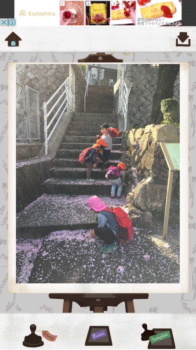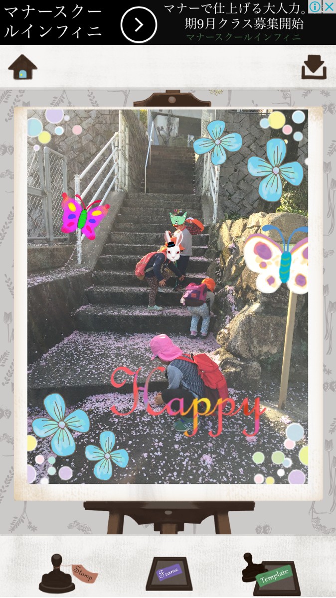 写真の加工は「スタンプ」「フレーム」「テンプレート」があります。それぞれ画面下に分かりやすいマークで表示されているので、使いたい素材のマークをタップして自分好みの加工をしましょう!スタンプは、画面下に出てくるマークで反転させたり大きさを変更したり自由自在にできます。