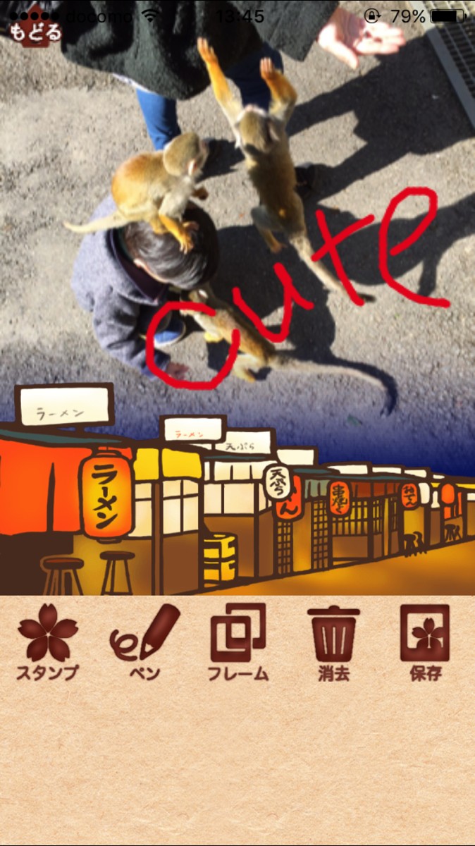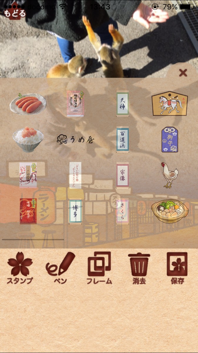 写真に「フレーム」「スタンプ」「ペン」で加工をしましょう。フレームは撮影のときにも選べますが、撮影時に選び忘れた場合でも加工で付け加えることができるので安心ですね。スタンプはうめ屋の看板商品である辛子明太子など博多をイメージした素材がたくさんあります。福岡のイメージ盛り沢山の加工を楽しんでくださいね!