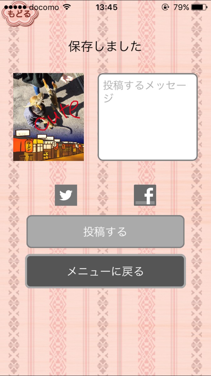 アプリを起動すると、レトロ感溢れる和モダンなデザインの壁紙が目を引きます。しかも、各アイコンを梅の花が囲んでいるので、とてもキュートです。加工画面は、加工をしやすいようにシンプルになっていますが、そのシンプルな中にも和のかわいさが感じられるアイコンになっています。アプリ内はどこを見てもかわいいので、アプリを開くのが楽しくなりますよ!