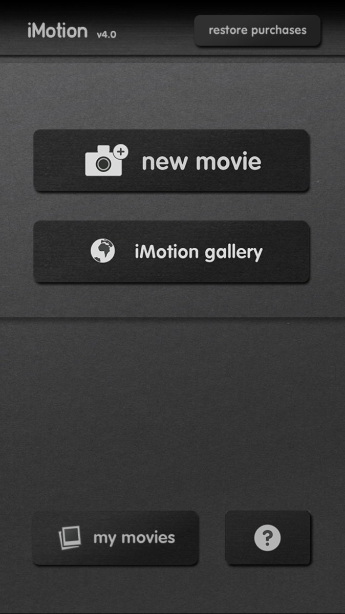上から順番に「restore purchases」カメラマークのある「new movie」地球マークの「iMotion gallery」アルバムマークの「my movies」最後に「?」です。
