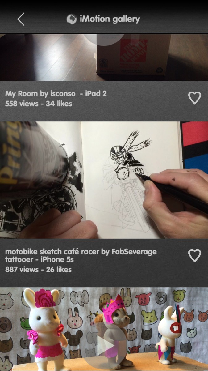また、「iMotion gallery」ではこのアプリで作成された、たくさんのユーザーの動画を楽しむこともできます。