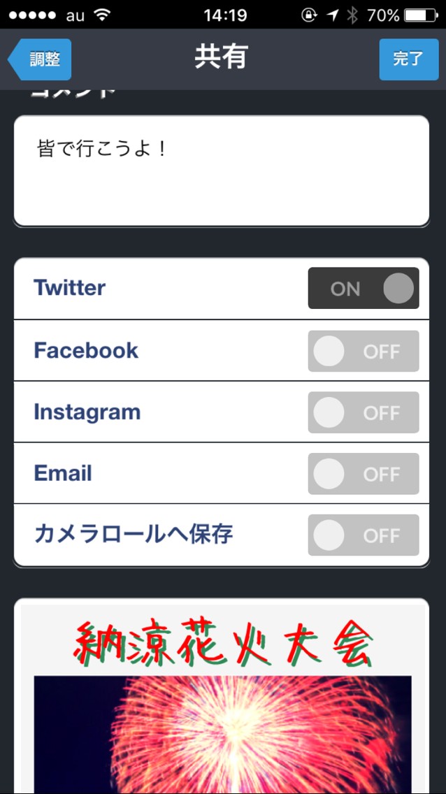 作成したフライヤーは、カメラロールに保存できます。また、ツイッターやフェイスブックなどのSNSで共有する時、コメントを添えることができて便利です。