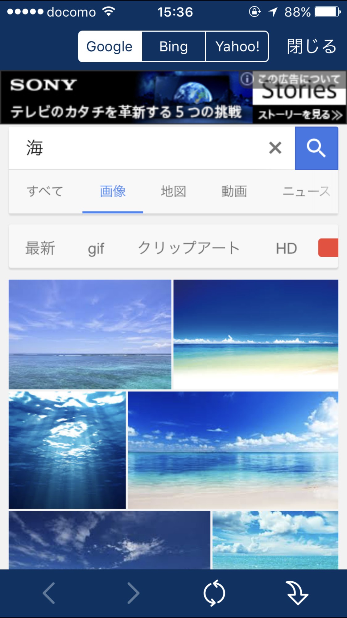 検索の方法ですが、ウェブを使って調べたい画像を入力して検索します。検索エンジンは「Google」「Bing」「Yahoo!」から選ぶことが出来ます。普段使い慣れた検索エンジンを使えるのは嬉しいですよね。検索結果は画像になっていますが、すべてやウェブなどに切り替えも可能です。様々なパターンで画像を検索することが可能になりますね。ちなみに検索エンジンは検索時にワンタップで切り替え可能になっているので、調べたい画像も素早く、そして、幅広く検索することが出来ますよ。