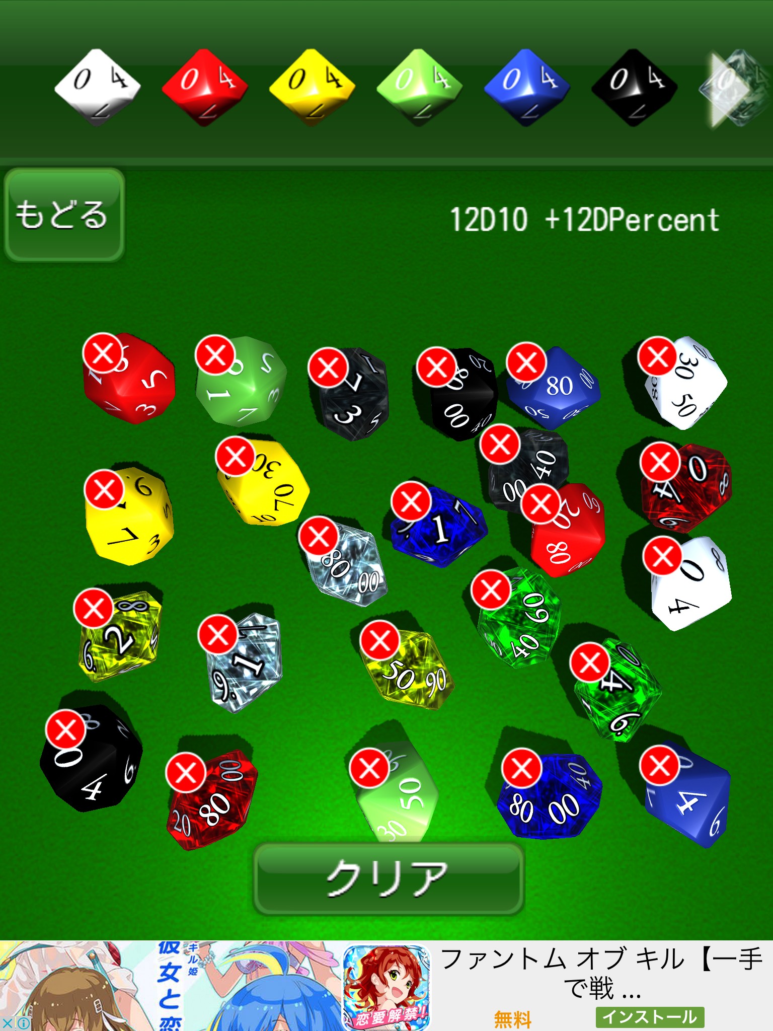 ダイスを追加する時は画面上部のダイスの絵から必要なダイスを必要な個数分タッチするだけで追加できます。