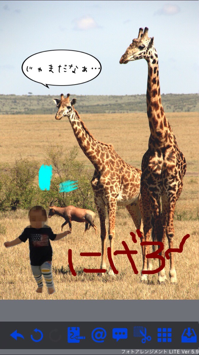 基本の編集が済んだら右端にある矢印のアイコンをタップし、アレンジ画面に移りましょう。手書き・テキスト入力・ふきだし・切り取りと合成・モザイクかけのペイント系の作業ができます。