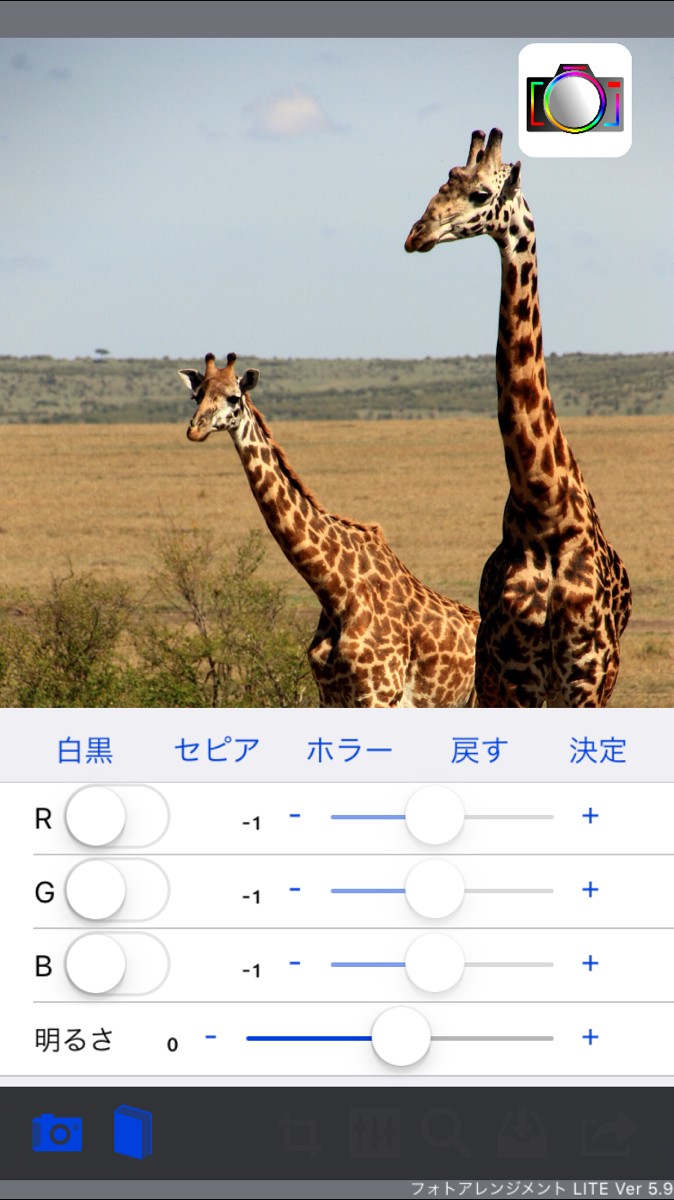白黒やセピアに変更できるだけでなく、RGBバーを使って色味の好みを調整できます。20段階で調整できるので、本格的なレタッチソフトより扱いやすい印象です。露出も変更できます。