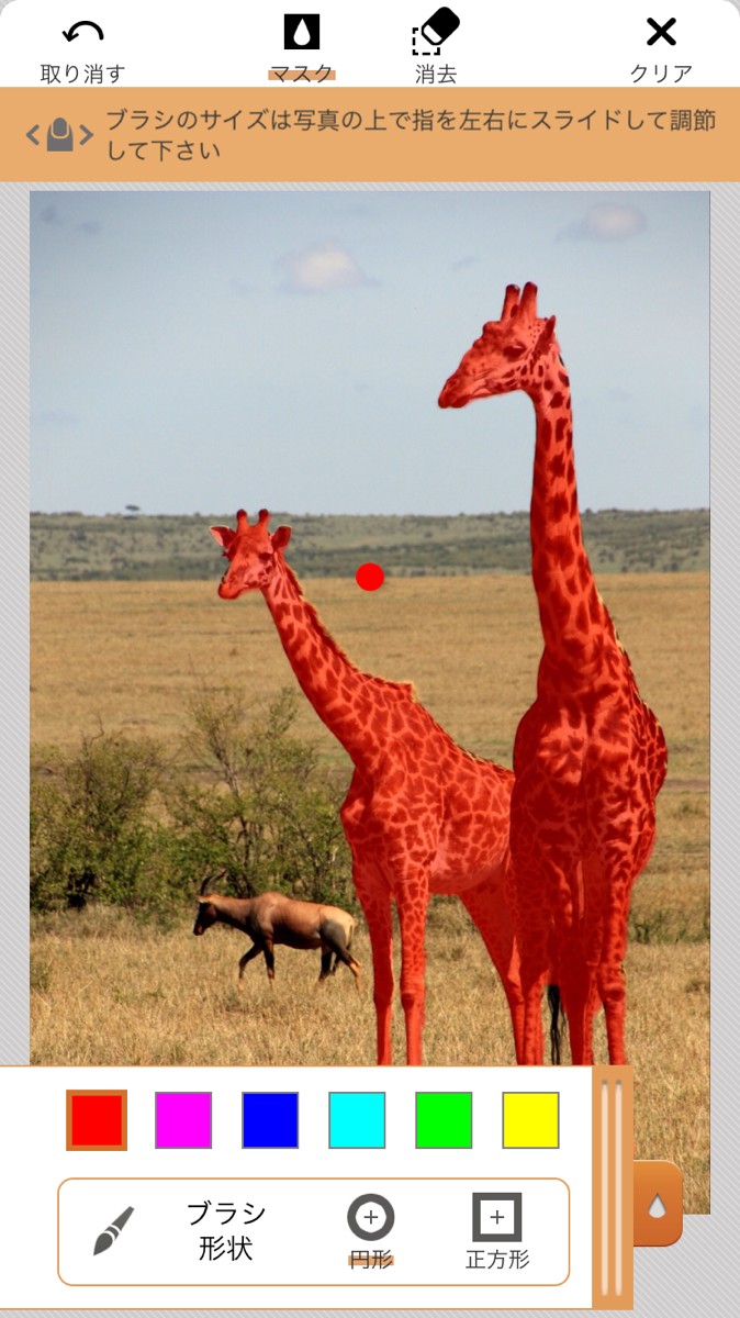 ライン際のきれいさが出来栄えに大きく影響するので、この機能は助かります。しかし、背景と色が似ていたりする部分はうまくマスクがかからないので、そこは手作業でマスクをかけていきましょう。マスクの色やブラシの形状も選べます。