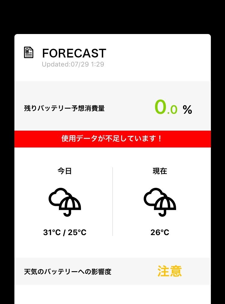 さらにさらに、その下にある天気のマークをタッチすると天気情報が。なんと天気が電池に与える影響度まで教えてくれます。