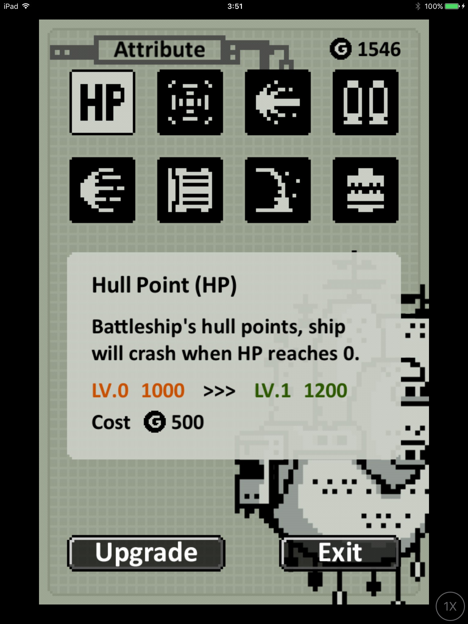敵を倒すとランダムで戦艦の各種ステータスを上げるパーツとお金をもらえます。パーツと戦艦のステータスはお金を使って強化できるので、余裕のあるときはやっておきましょう。