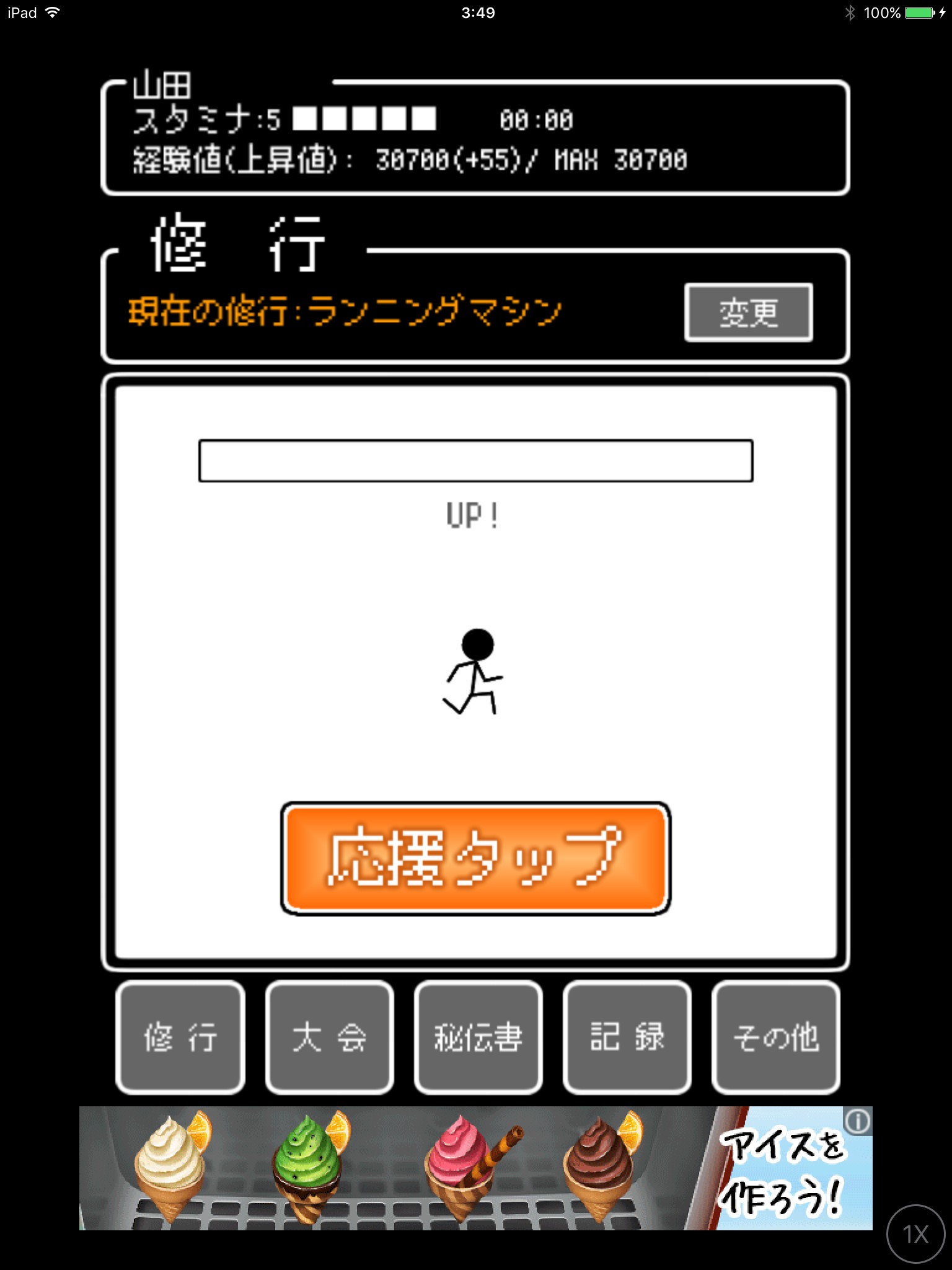 まずは修行を行いましょう。といってもプレイヤー側がすることはメニューを選んで見守るだけ。あとは棒人間が勝手に修行をしてくれます。修行をすることで一定間隔毎に経験値がたまり、