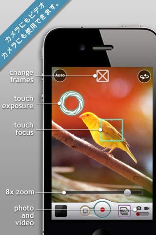 そのほか、7種類のフレームも楽しんでいただけます。カメラだけではなくて、ビデオ撮影ができるのも特徴のひとつです。