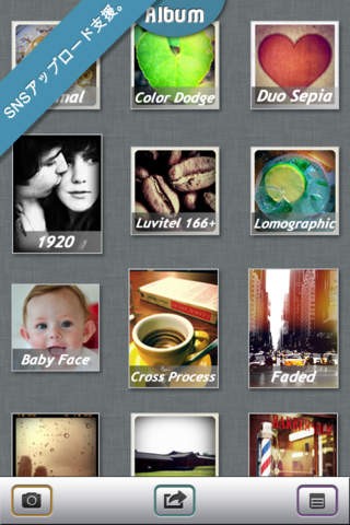 豊富な種類のフィルターとフレームでいつもと違う写真を撮影することができます。このアプリをひとつ持つだけで、たくさんのカメラを持っている感覚になります。