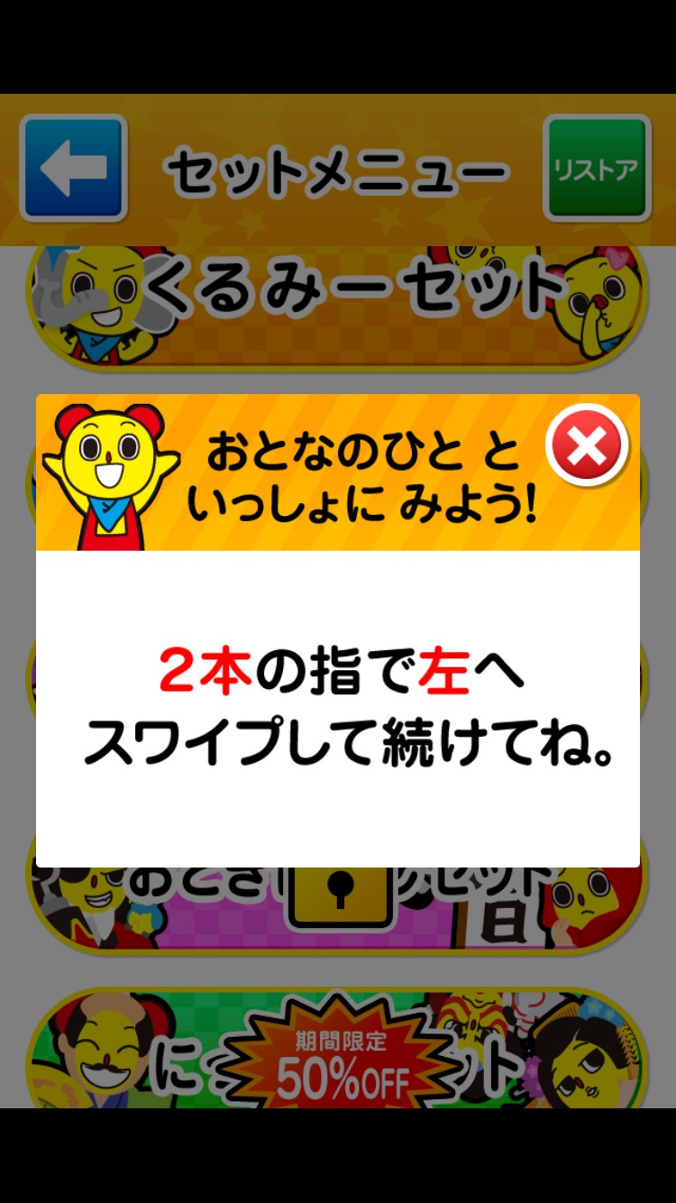 ・画面は見やすく。課金されるボタンはお子様が押しても先に進めないようになっています。